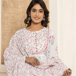 Pink And White Floral Print Piping Anarkali Style Kurta And Trousers With Dupatta Set