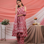 Pink Ethnic Motifs Cotton A Line Kurta Trouser & Dupatta Set