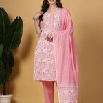 Pink Floral Print Straight Kurta Trouser Dupatta Set