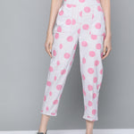 Pink & Grey Polka Print Tapered Pants, in Cotton Flex fabric, Unlined, Ankle Length, Comfort Fit, Elasticated Waistline, Straight Hemline and features Contrast Stitch Detail