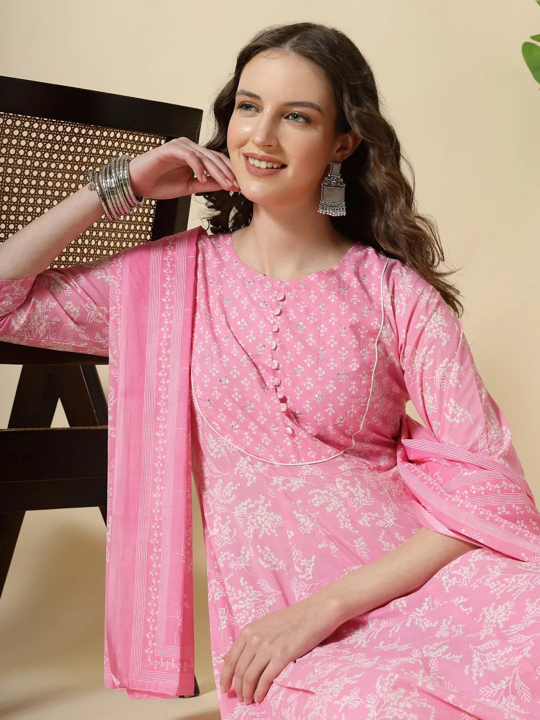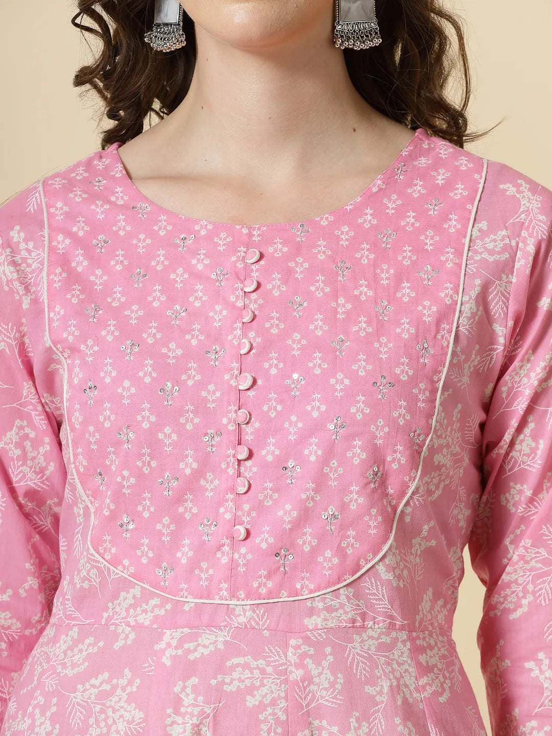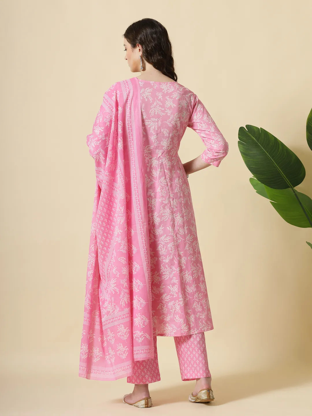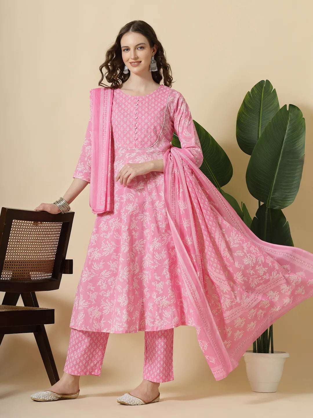Pink Pure Cotton Anarkali Piping Kurta Dupatta Pant Set