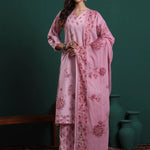 Pink Pure Cotton Floral Beads And Stones Kurta Pants & Dupatta Set