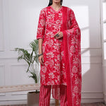 Pink Floral Straight kurta Trouser Dupatta Set Kurta Design Floral Print,Kantha Work Straight Shape Three quarter sleeve V-Neck Calf Length Kurta Straight Hem Side Slits Machine Weave Cotton Trouser Design:One pocket Pure Cotton Trouser Slip-On Waist Size & Fit Material & Care Pure Cotton Dry Clean