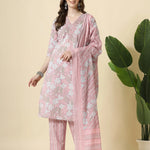 Pink Pure Cotton Floral Print Thread Work Kurta Set With Pant & Dupatta