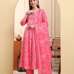 Pink Pure Cotton Floral Thread Work Anarkali Kurta Trouser Dupatta Set