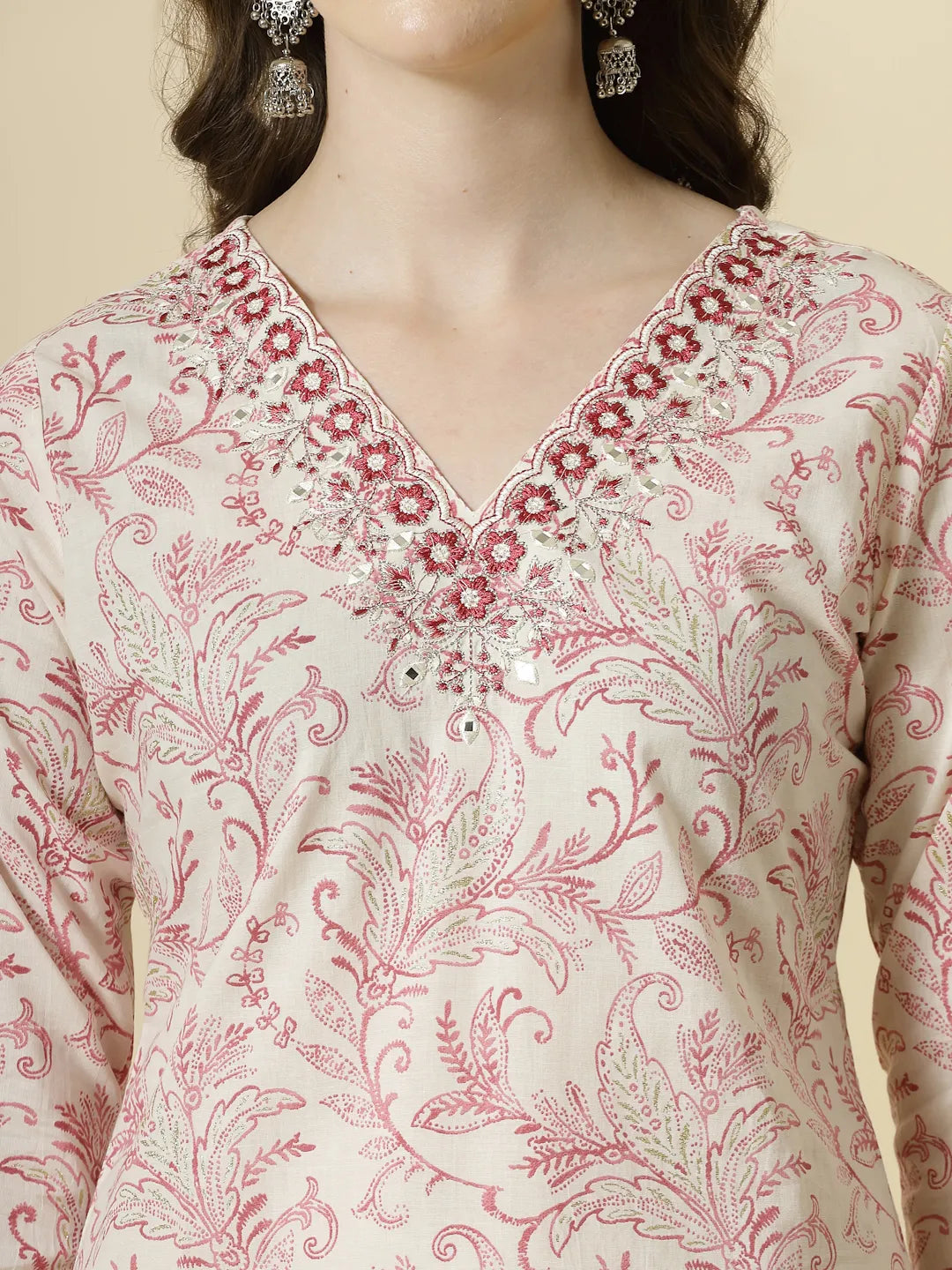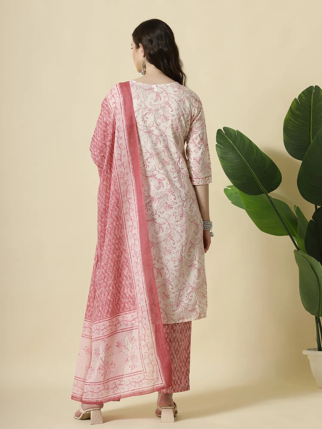 Pink Pure Cotton Paisley Thread Work Kurta Dupatta Pant Set