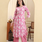 Pink Floral Print straight kurta Trouser Set kurta Design Floral straight Shape Three quater sleeve Round Neck Calf Length kurta straight Hem Machine Weave Sied Silt button closure top Pure Cotton Trouser Design:One pocket Pure Cotton Trouser Slip-On Waist Size & Fit Material & Care Pure Cotton Dry Clean