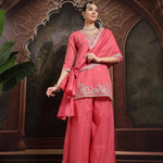 Pink Silk Blend Embroidered Straight Kurta Dupatta Palazzo Set