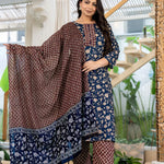 Piping On Yoke Floral Print Blue Cotton Plus Size Kurta Set With Dupatta Set