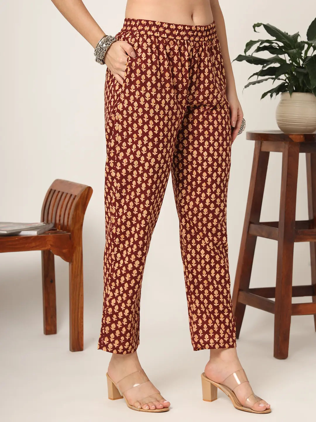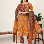 Piping On Yoke Floral Print Mustard Cotton Kurta Set With Dupatta Set