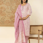 Pure Cotton Lavender Floral Embroidery Kurta Dupatta Pant Set