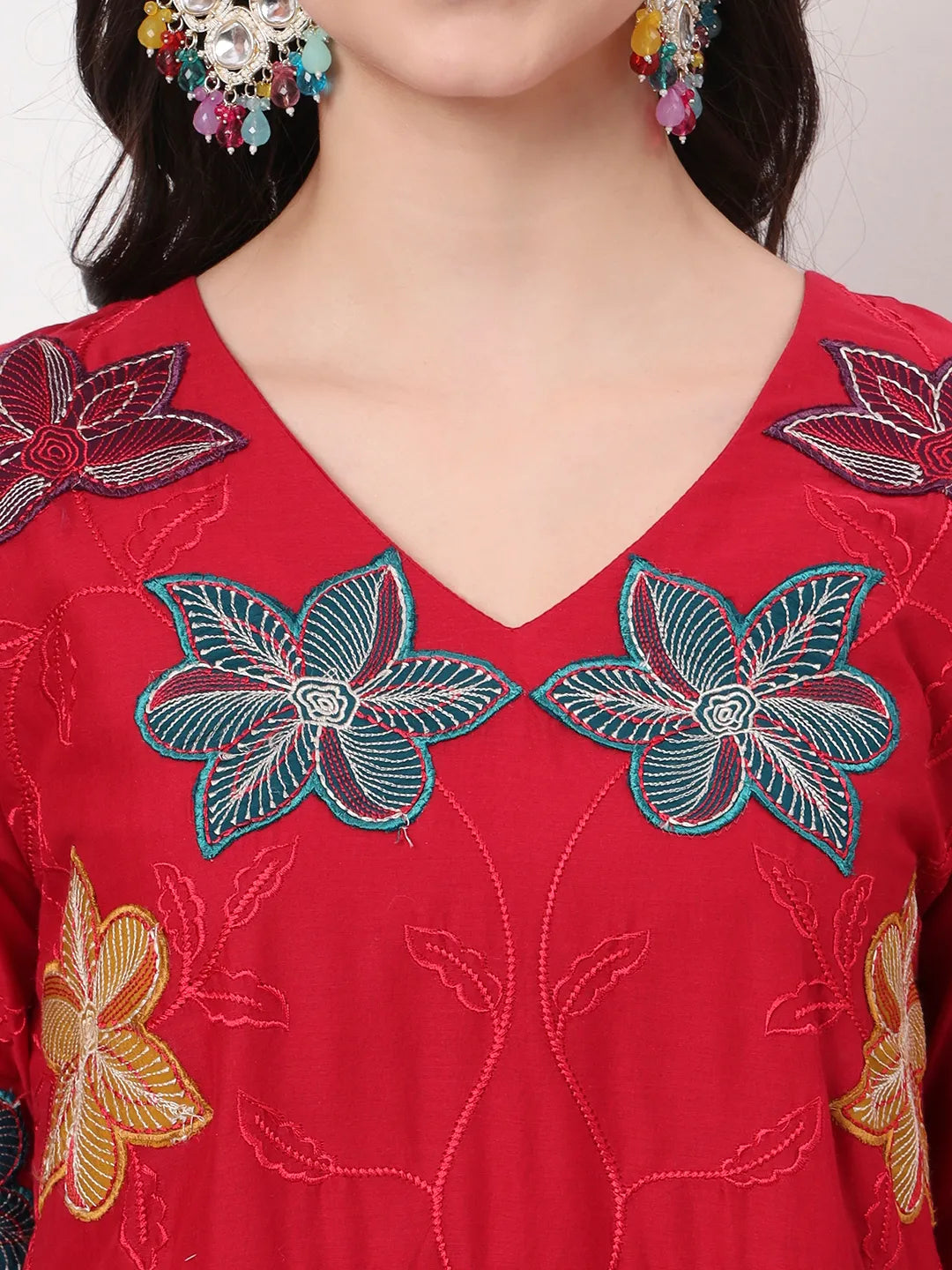 Red Floral,Kantha_Work kurta Trouser Dupatta Set, Kurta Design Kantha_Work Anarkali Shape Three quarter Regular Sleeves Round-Neck Calf Length Kurta Flared Hem Linen Machine Weave Lining Fabric Cotton Trouser Design:Printed one pocket Pure Cotton Trouser Slip-On Waist Size & Fit Material & Care Pure Cotton Dry Clean