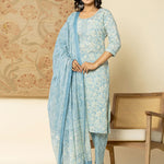 Pure Cotton Sky Blue Floral Embroidery Kurta Dupatta Pant Set