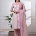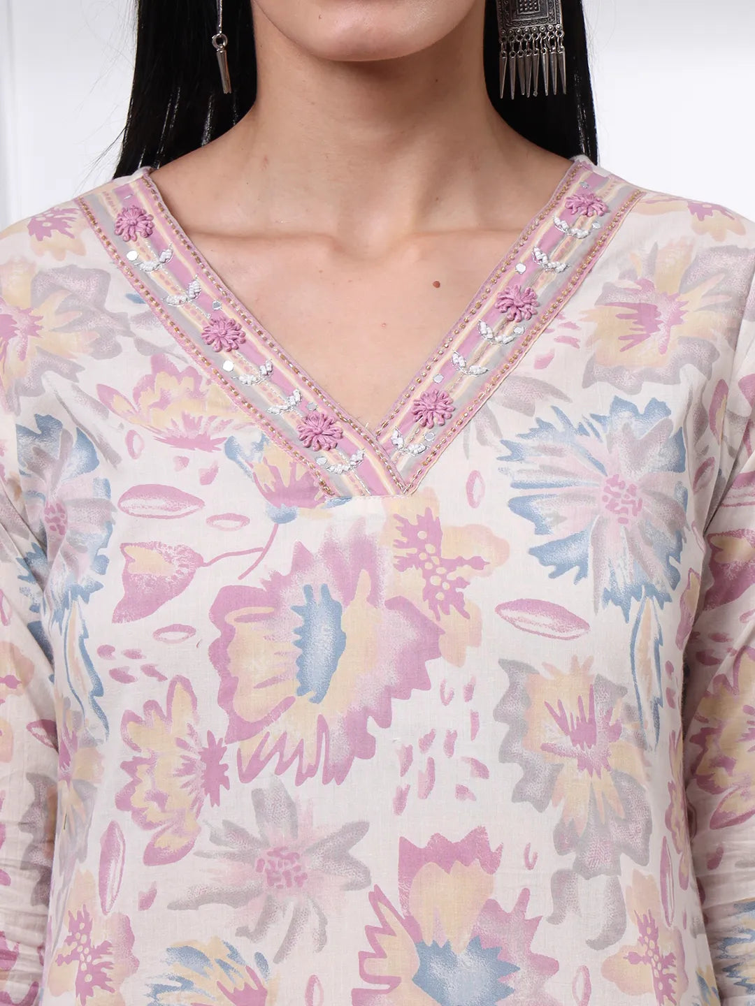 Purple And White Floral Print Straight Kurta Trouser Dupatta Set