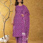 Purple Bandhani Cotton Straight Kurta Trouser & Dupatta Set