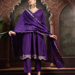 Purple Embroidered A-Line Kurta Trouser Dupatta Set