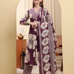Purple Floral A-Line Kurta Trouser Dupatta Set