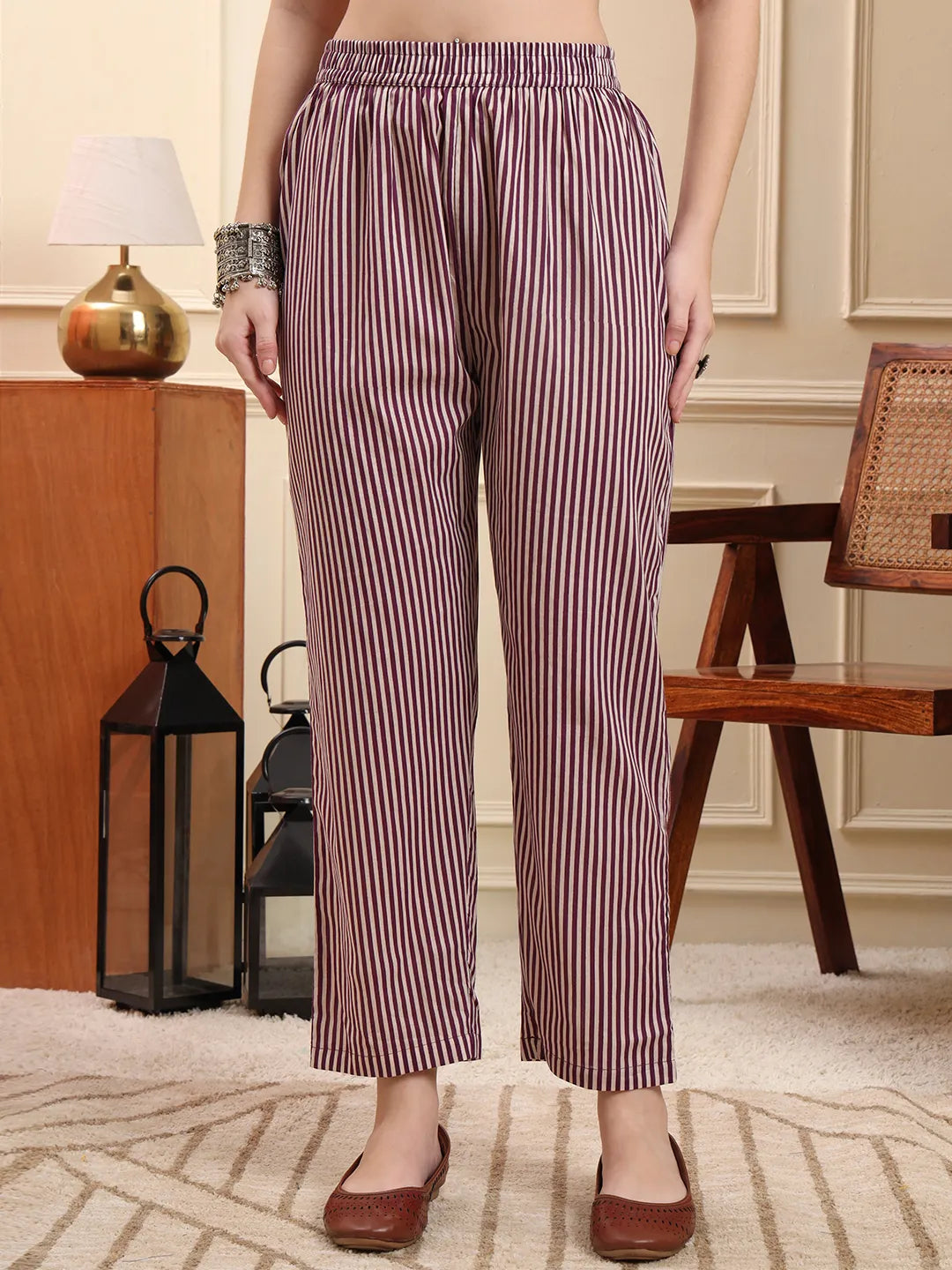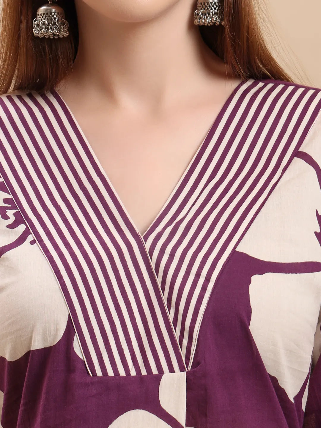 Purple Floral A-line kurta Trouser Dupatta Set kurta Design Floral A-line Shape Three quarter sleeve V-Neck Calf Length kurta Flared Hem Machine Weave Cotton Trouser Design:One pocket Pure Cotton Trouser Slip-On Waist Size & Fit Material & Care Pure Cotton Dry Clean