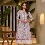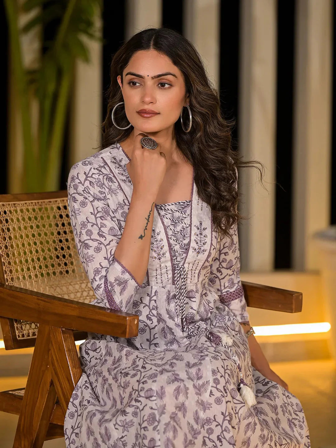 Purple Floral Print Kantha Work A Line Dori Work Dress