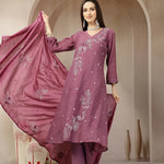 Purple Mul Chanderi Kantha Work Kurta Dupatta Pant Set