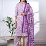 Purple Pure Cotton Ethnic Motifs Straight Kurta Trouser Dupatta Set