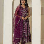 Purple Pure Cotton Fit And Flare Tiered Kurta Trouser & Dupatta Set