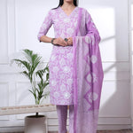 Purple Pure Cotton Floral Print Zari Work Straight Kurta Set