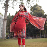 Red Cotton Beads And Stones Pakistani Straight Kurta Trouser Dupatta Set