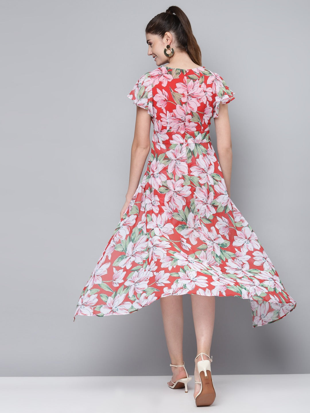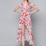 Red Floral Maxi Romper , in Weightless Georgette fabric, Polyester, Maxi Length, Comfort Fit, Zipper Closure, Straight Hemline and features Maxi Romper