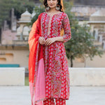 Red Floral Print Anarkali Kurta Trouser And Dupatta Set