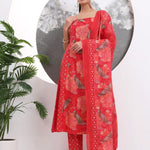 Red Floral Print Sequins Work Cotton Kurta Trouser With Dupatta Set