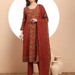 Red Floral Print Thread Work A-Line Kurta Trouser Dupatta Set