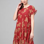 Red Floral Tiered Trapeze Dress, in Weightless Georgette fabric, Polyester Lining, Above Knee, Comfort Fit, Button Closure, Flared Hemline and features Tiered Dress