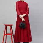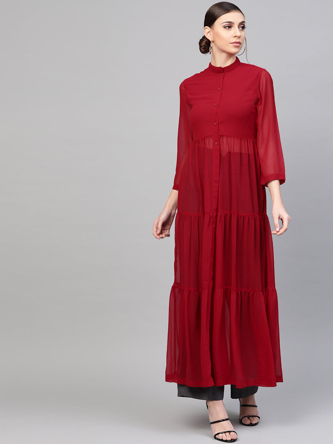 Red Front Open Sheer Tiered Maxi Top, in Weightless Georgette fabric, Polyester Lining, Full Length, Fit And Flare, Button Closure, Flared Hemline and features Laundry Button At Front