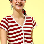 Red & White Stripe V-Neck Rib Crop Top, in Cotton Rib fabric, Unlined, Crop Length, Comfort Fit, Button Closure, Straight Hemline and features DTM Button Detail At Front