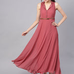 Rose Pink Notched Collar Belted Maxi, in Georgette fabric, Polyester Lining, Full Length, Fit And Flare, Zipper Closure, Flared Hemline and features PU Belt On Waist