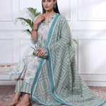 Sea Green And White Floral Print Anarkali Kurta Trouser Dupatta Set