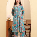 Sea Green Floral Print A-Line Kurta Trouser Set