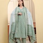 Sea Green Pure Cotton Floral Sequins-Work Straight Kurta Trouser Dupatta Set