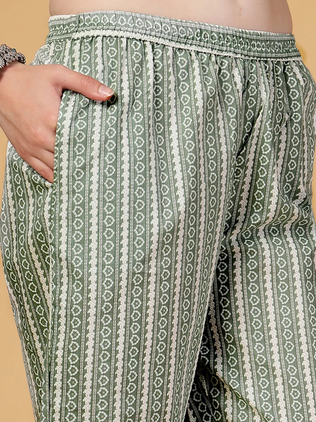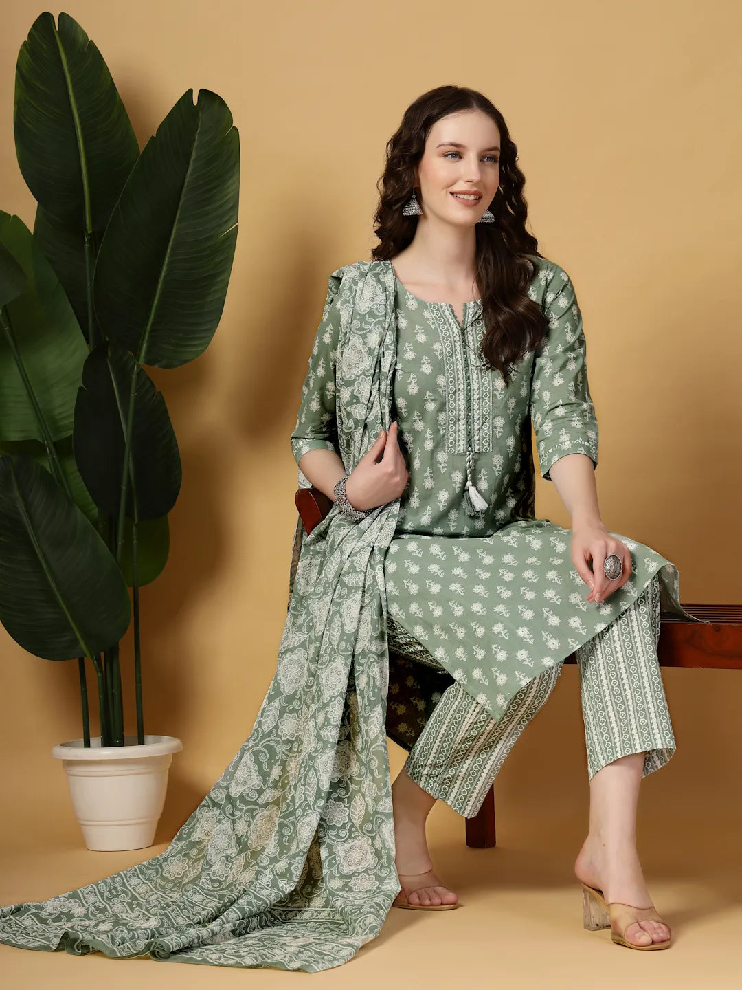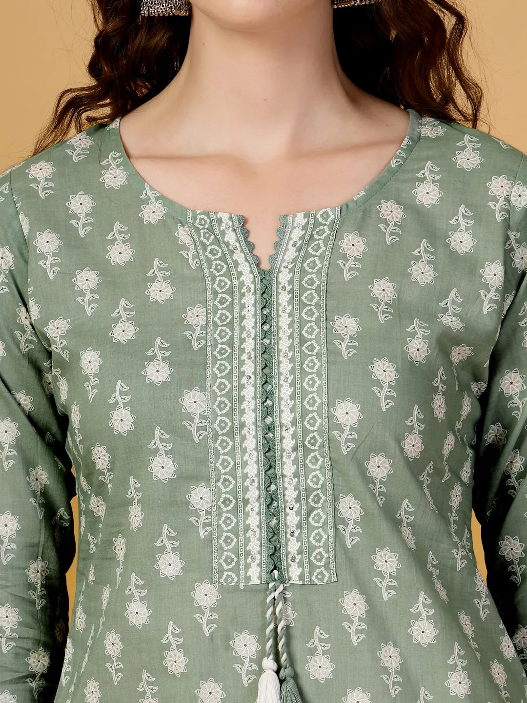 Sea Green Pure Cotton Floral Lace Work Kurta Dupatta Pant Set