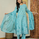 Sky Blue Floral Print Pure Cotton Kantha Work A-Line Kurta Trouser Dupatta Set