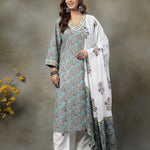 Sky Blue Paisley Cotton Straight Kurta White Trouser White Dupatta Set
