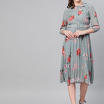 Steel Blue Floral Peterpan Collar Pleated Dress, in Weightless Georgette fabric, Polyester Lining, Midi Length, Fit And Flare, Button Closure, Flared Hemline and features Self Fabric Belt At waist