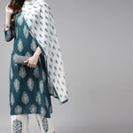 Teal Green & Off-White Printed Dupatta Set