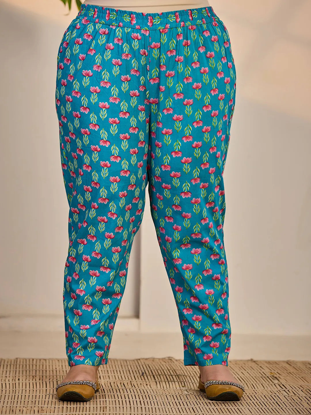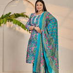 Turquoise Blue Cotton Lace Work Straight Plus Size Kurta Trouser Dupatta Set