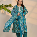 Turquoise Blue Cotton Straight Plus Size Kurta Trouser Dupatta Set