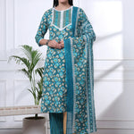 Turquoise Blue Floral Lace Work Cotton Straight Kurta Trouser Dupatta Set