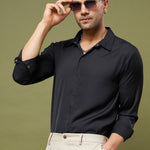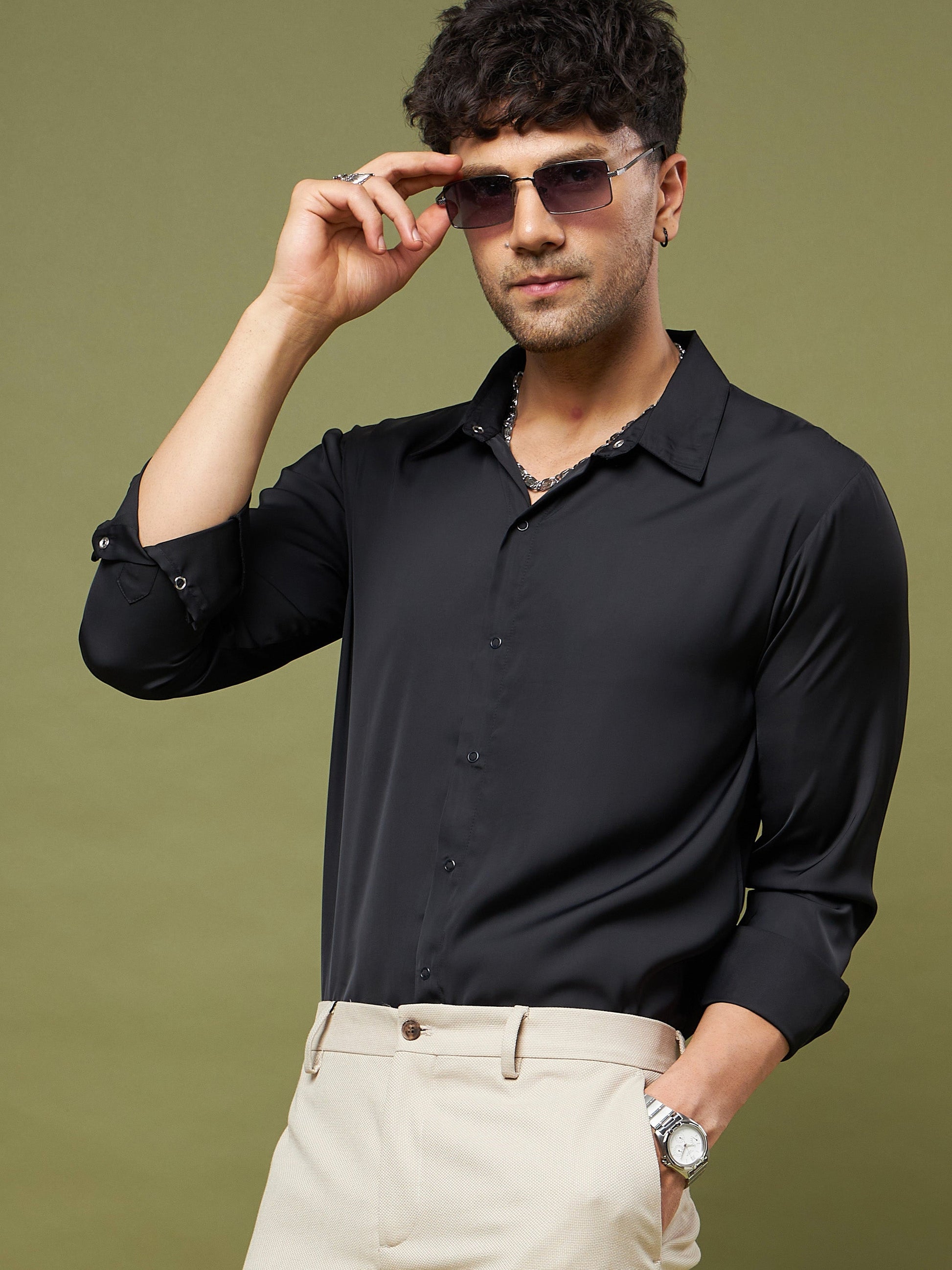 Unisex Black Satin Relax Fit Shirt, in Satin fabric, Unlined, Regular length, Relax Fit, Button Closure, Straight Hemline and features Metal Ring Button Detail