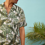 Unisex Olive Tropical Print Relax Fit Shirt, in Rayon fabric, Unlined, Regular length, Relax Fit, Button Closure, Straight Hemline and features Box Pleat Detail At Back