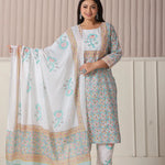 White And Blue Cotton Straight Plus Size Kurta Pant Dupatta Set